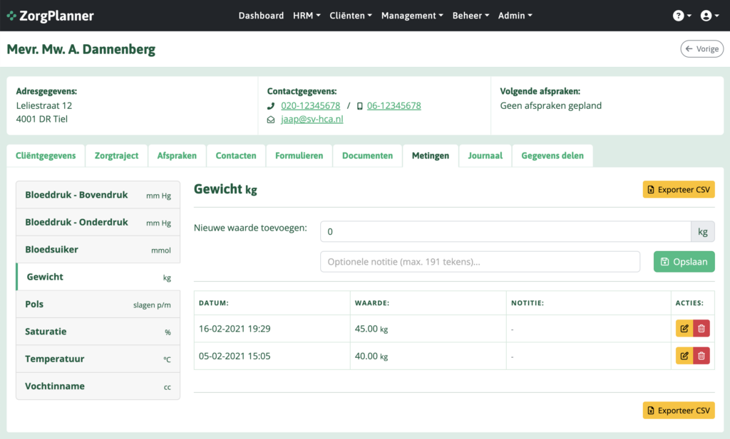 De resultaten van de metingen die via de Cliënten op het Planbord worden gedaan, komen hier ook terecht. Tevens kun je hier zelf metingen invoeren en meetresultaten aanpassen of verwijderen.